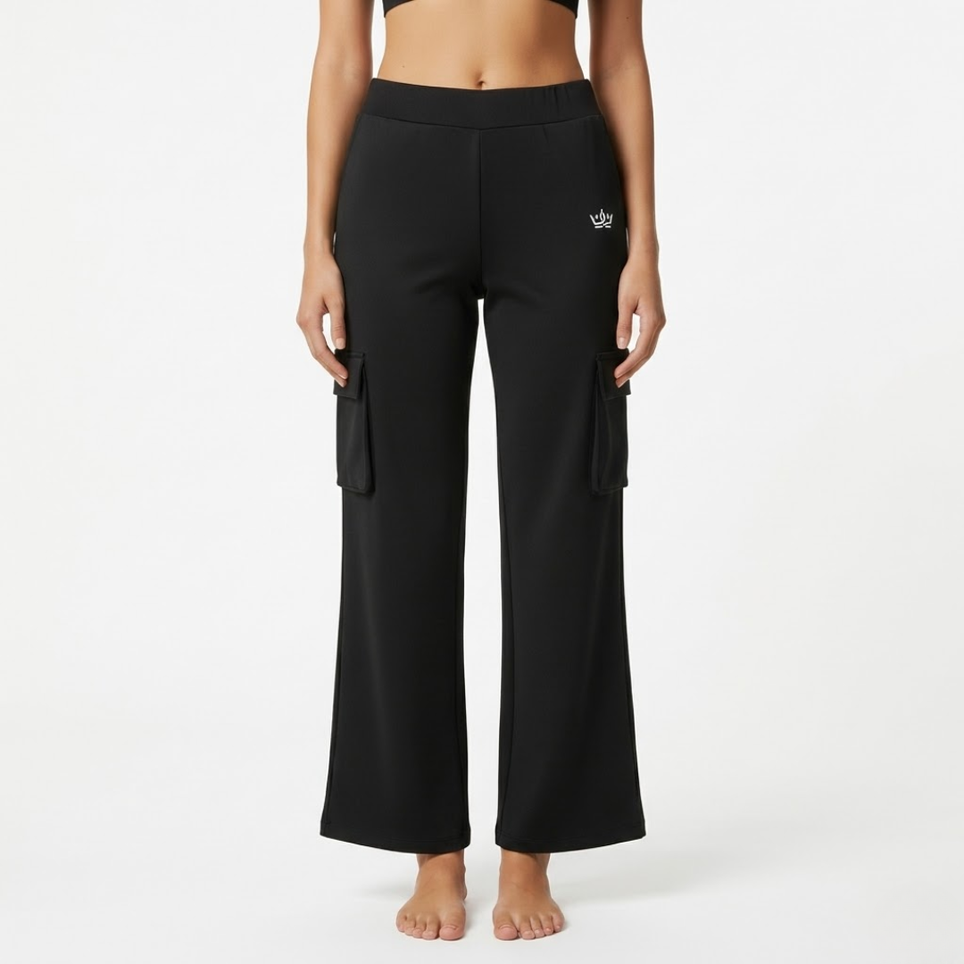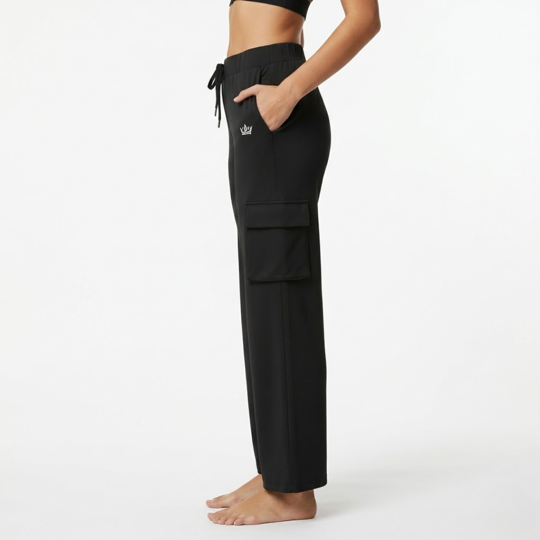 Utility Lounge Pants: High-waisted black cargo joggers with a relaxed straight-leg fit. Designed with functional side-thigh pockets and the signature silver crown logo on the hip.