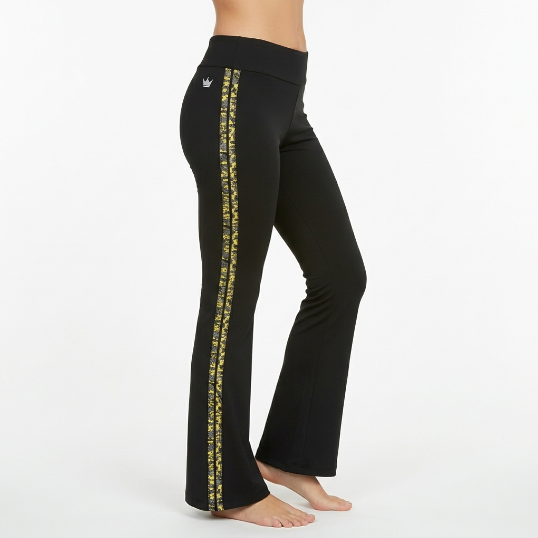 Statement Bottoms: Features high-waisted black leggings with a trendy flare/bell-bottom cut. Includes a striking yellow-patterned side stripe and a signature silver crown logo on the hip.